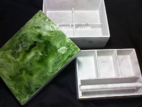 PAP:Depois da peça lixada e com a base ou PVA, pintei as partes inferiores da caixa com tinta acrílica branca e marmorizei suavemente, depois disso, joguei uma boa quantidade de hidro vitral branco e do verde. Fui inclinando a tampa da caixa até que as cores se encontrassem e fossem se misturando, dando esse efeito... Pra chegar até os cantinhos, pode ajudar com um pincel bem macio... Caso borre as laterais, passe um pano limpo e úmido na mesma hora, mesmo sendo à base d’água, se demorar a limpar, pode manchar o trabalho!... Deixe secando sobre uma mesa (Lugar plano) e nada de poeira por perto! rsrs ... Agarra no hidro!