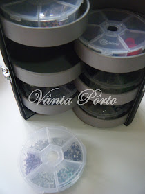Na verdade, o uso seria para peças de montagem de bijouterias. Com seis caixinhas redondas, cada uma delas com seis divisórias... Perfeita para o meu caso! rsrs
