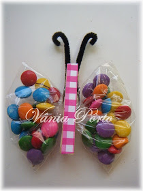 O corpo da borboleta é um pregador de madeira forrada com papel de scrapbook, as antenas são de chenille. Suas asas são M&M's em saquinho de polipropileno...