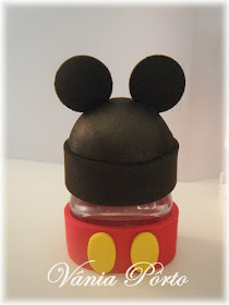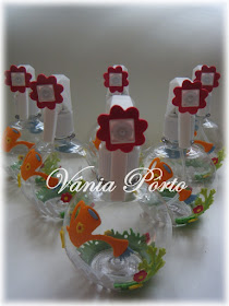 Mais embalagens impressas, cestinha de higiene (Que comprei e também não achei graça - descolei algo que estava ali para caber aquela caixinha azul), xilofone - madeirinhas minúsculas pintadas, o batedor é uma pérola com alfinete. O chocalho é um palito de dente e uma conta para bijuteria, além da fitinha. O ursinho botão de scrap e rosa (rs), pintei com tinta PVA.