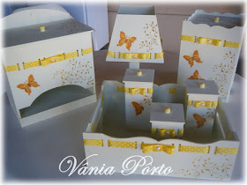 O enfeite na parede, um mini pratinho com papel de scrap impresso com o nome, borboletinha e flores e folhas de tecido. O porta mamadeiras e chupetas foi feito de barbantinho de scrap.